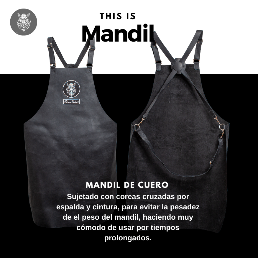 Mandil de Cuero de Res, sujetado con coreas cruzadas por espalda y cintura, para evitar la pesadez de el peso del mandil, haciendo muy cómodo de usar por tiempos prolongados.